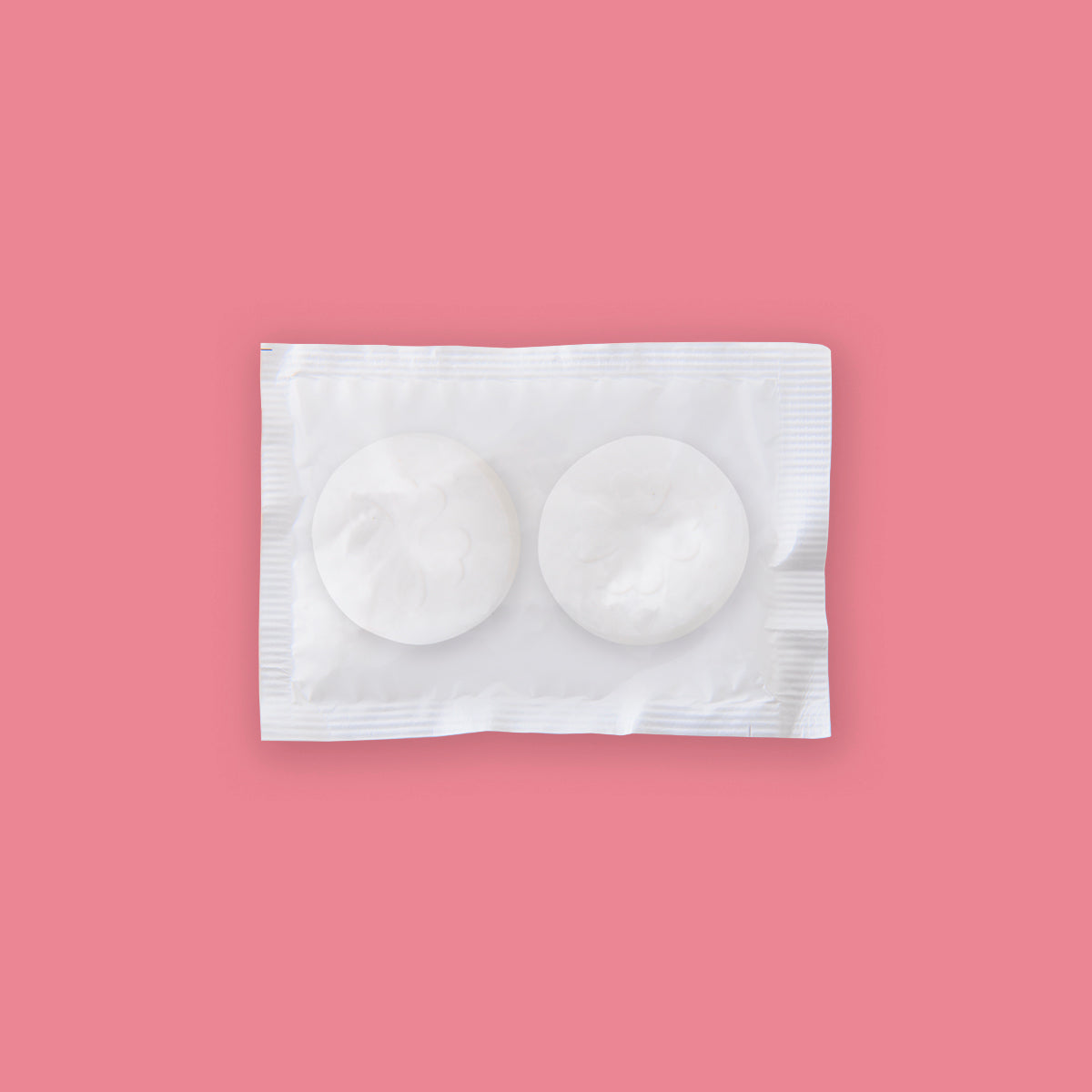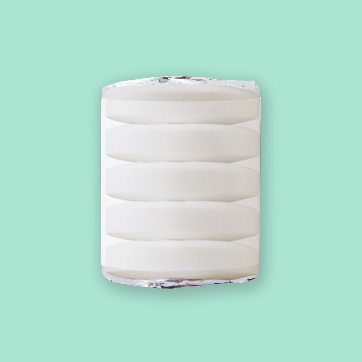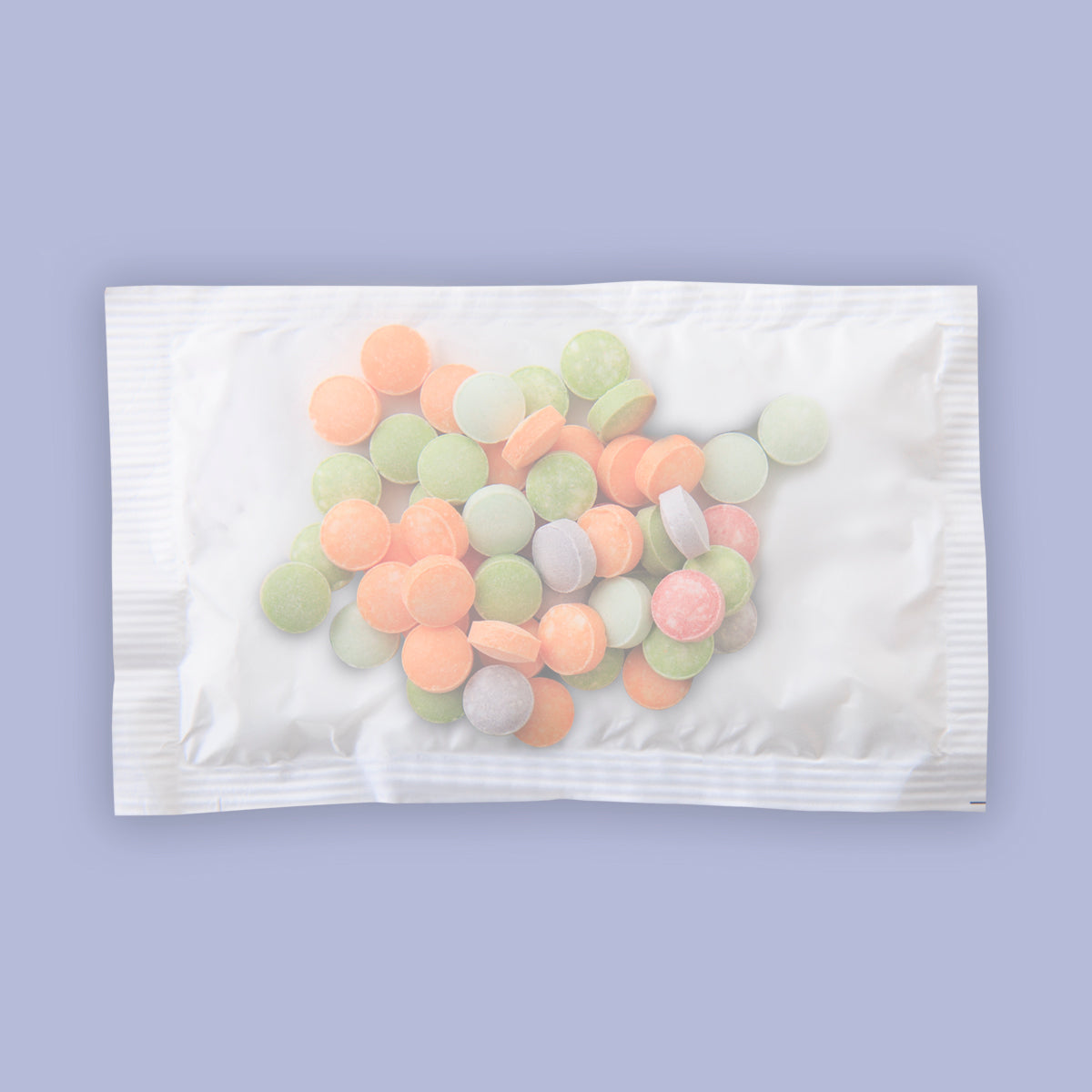 Small round tablets available in a variety of wrappers and flavors, both mint and sweet.