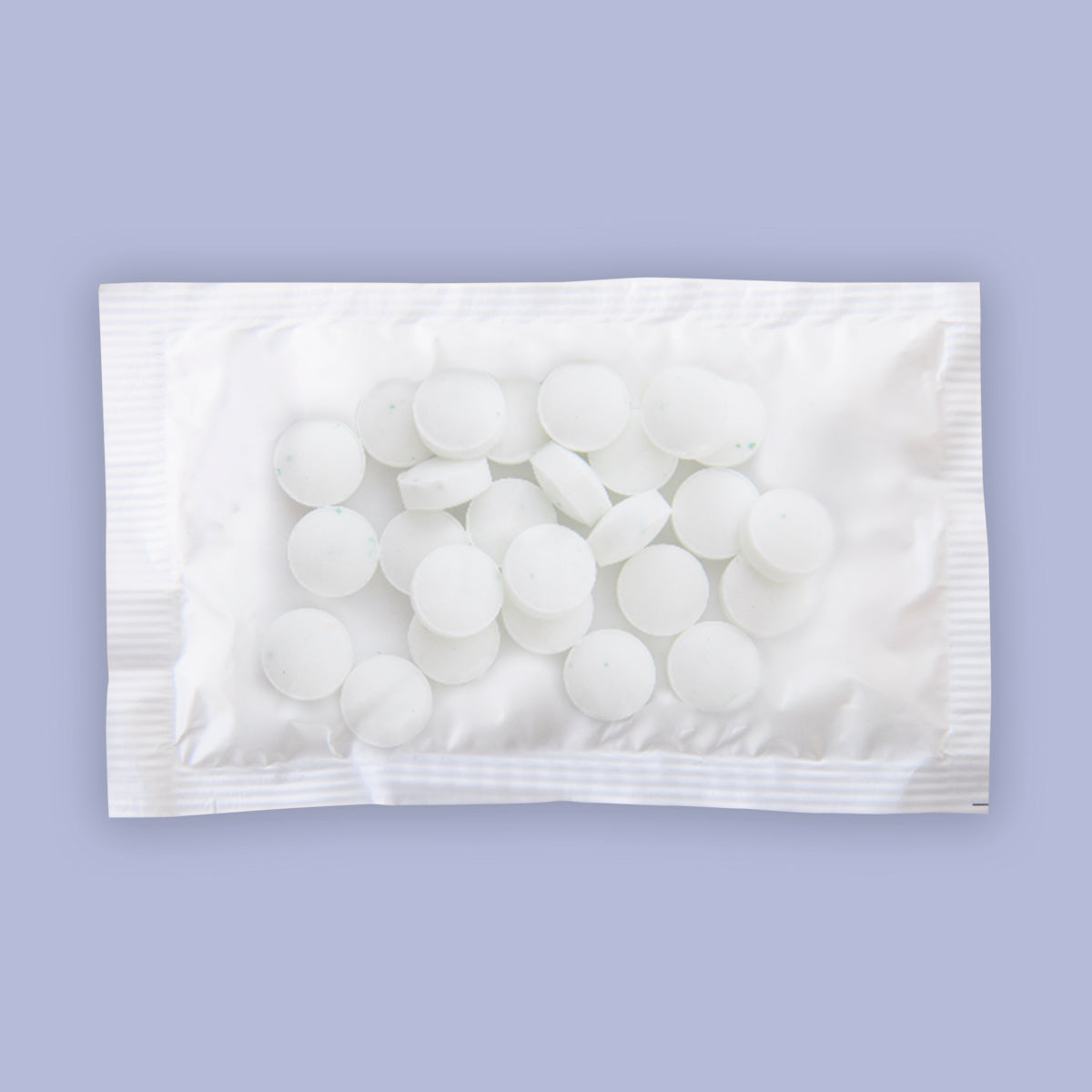 Rectangle package with approximately 0.25 oz of small mint or candy tablets.
