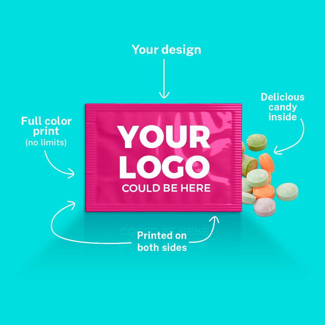 This handy pack is your go-to for a quick pick-me-up, no matter where the day takes you. Each package is filled with approximately 0.25 oz. of small mints or candy tablets. The package can be customized on both sides with a full color print with no set-up fee. Flavor options include: Spearmint, Peppermint, Wintergreen, Cinnamon, Assorted Tangy Fruit, Mint Chocolate or Spicy Tamarind.